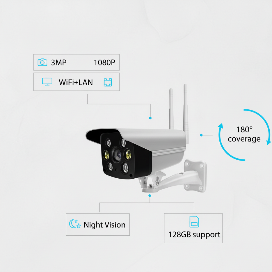 New Arrival WaterProof Outdoor IP Camera এসেছে নতুন আপগ্রেড ফিচার নিয়ে। 3MP (1080P HD) Ultra Clear Resolution, Own WiFi System, LAN Port, Two-Way Audio এবং 180° Wide Angle Coverage থাকায় এটি একাই করবে সম্পূর্ণ এরিয়া মনিটরিং।